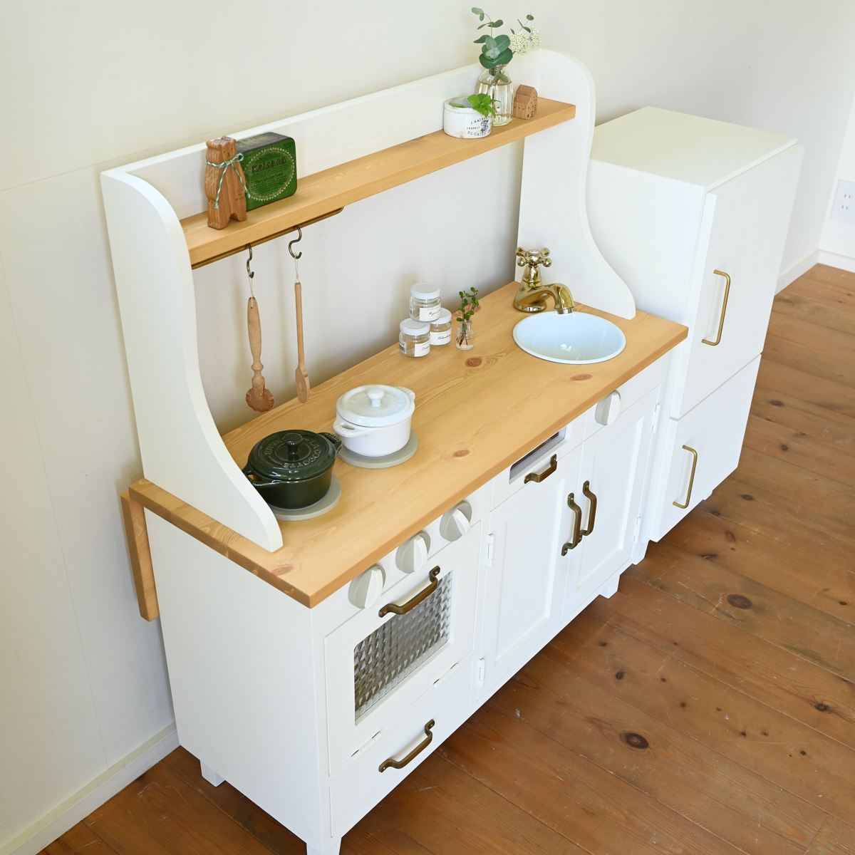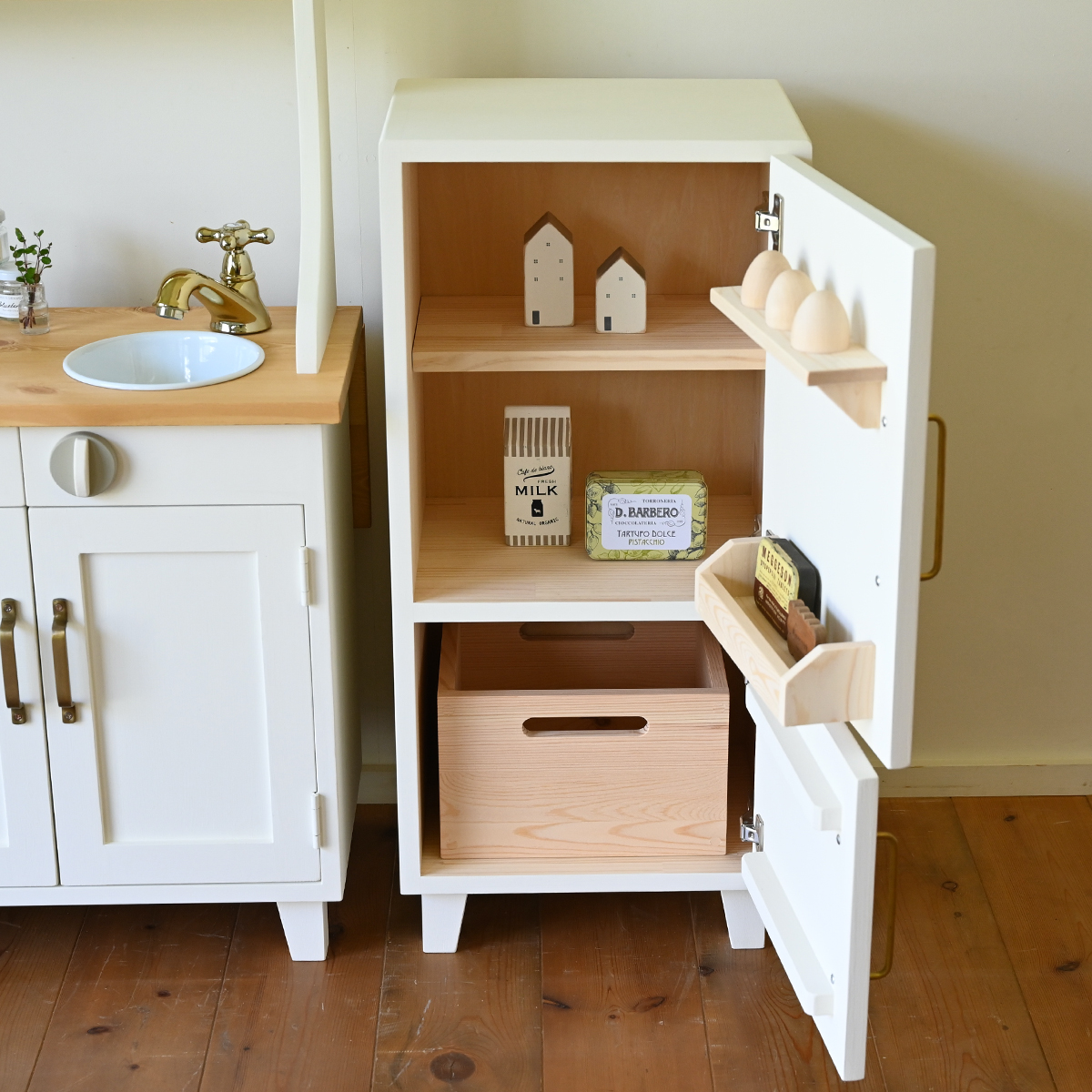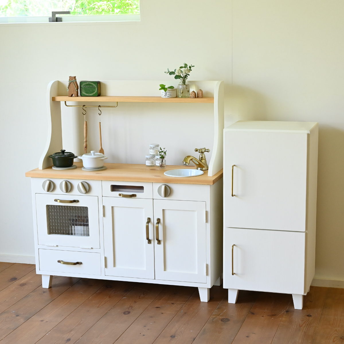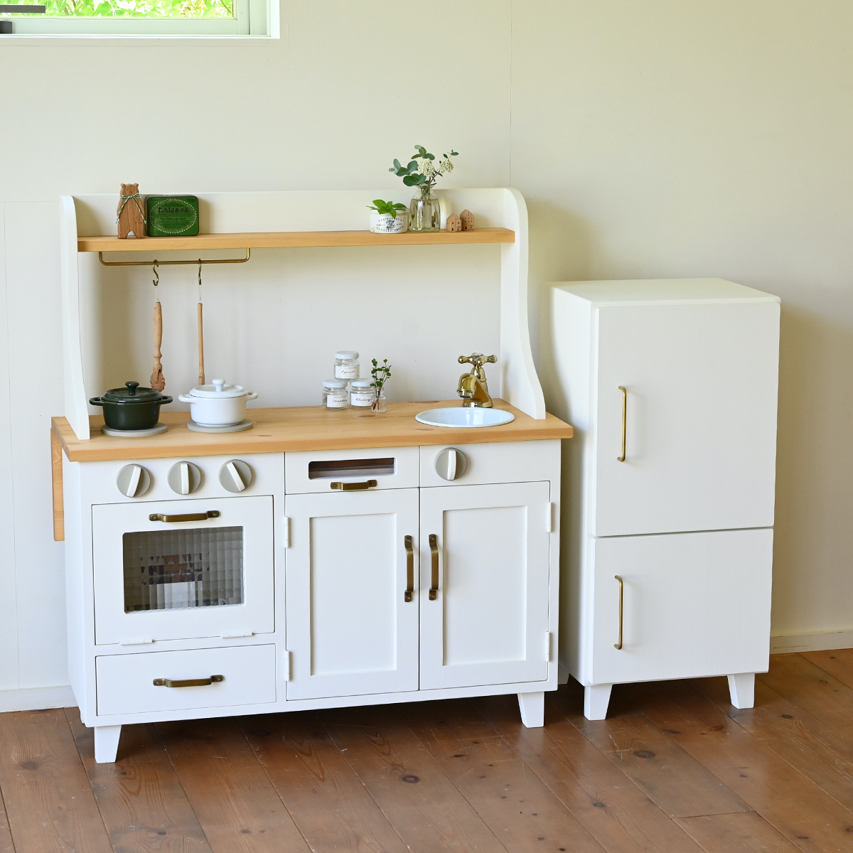 小さめの冷蔵庫とままごとキッチンの組み合わせです。