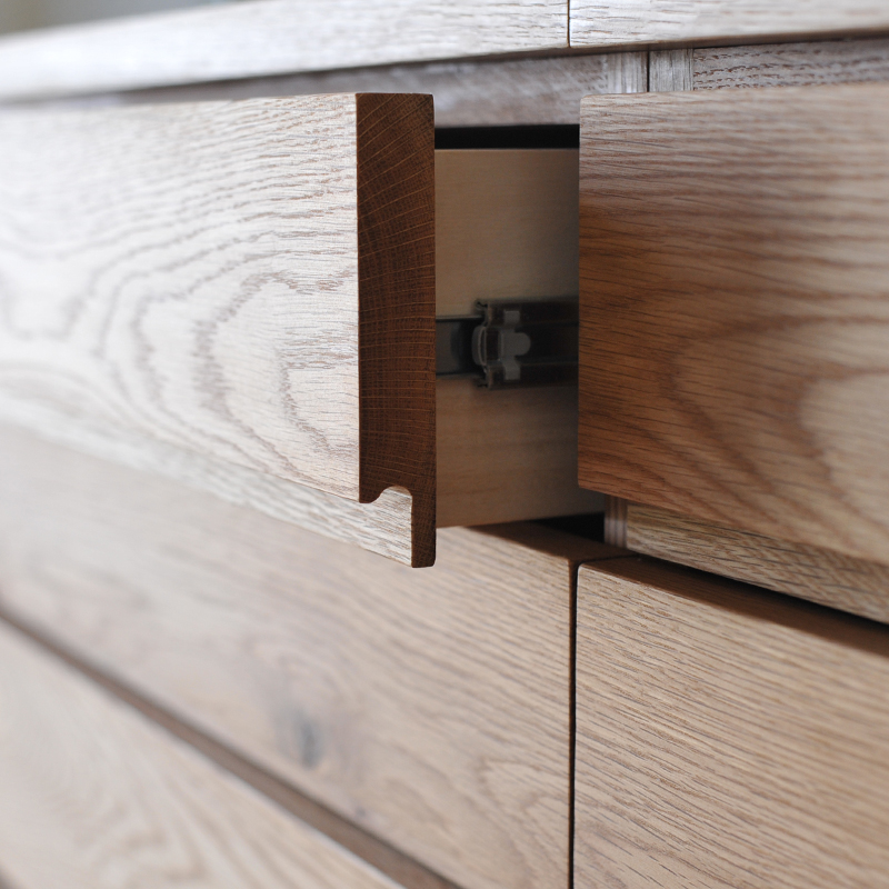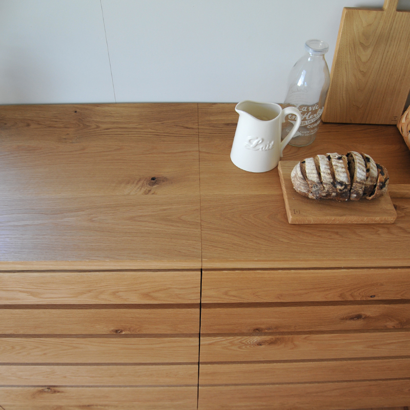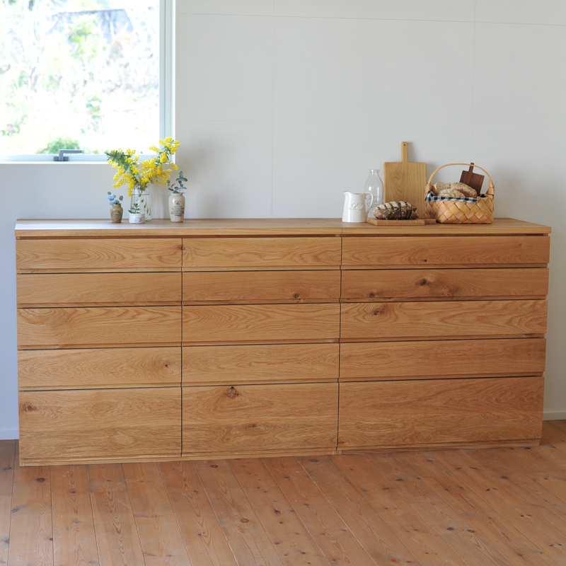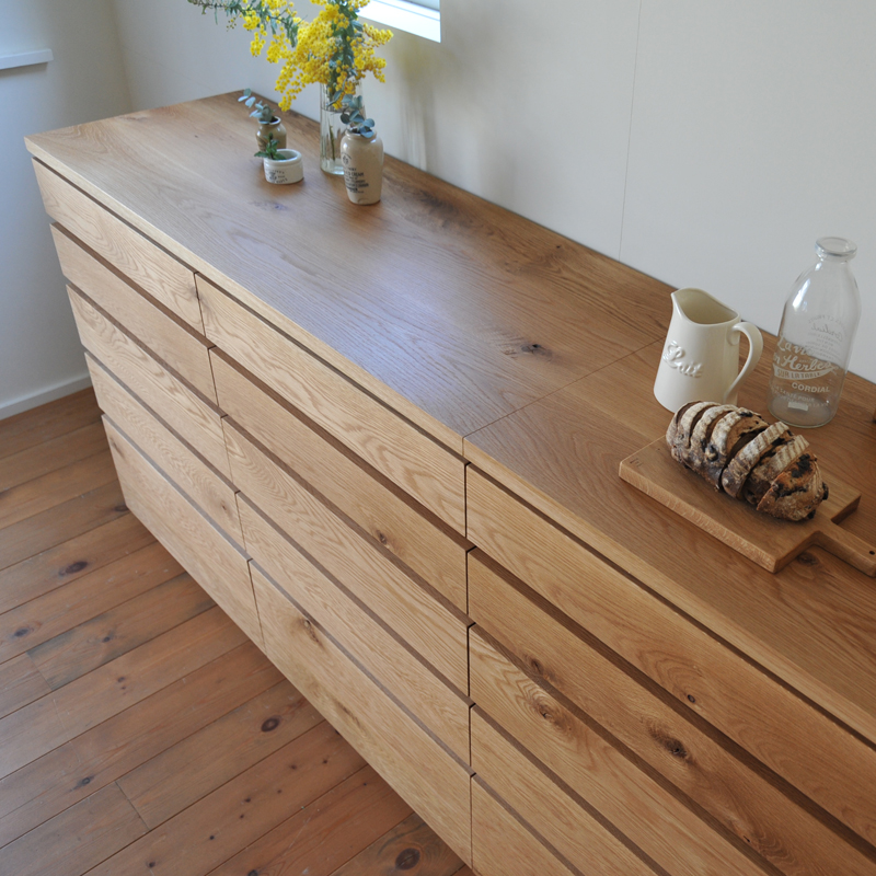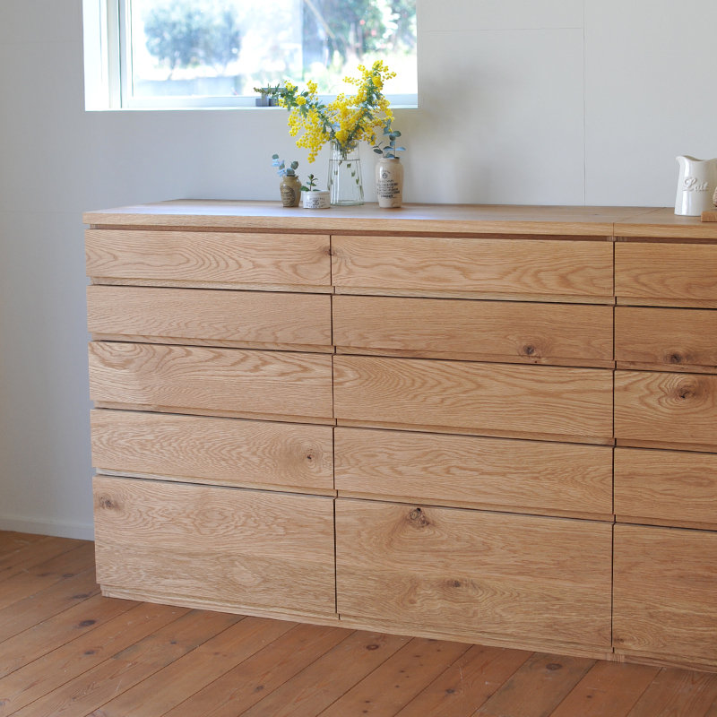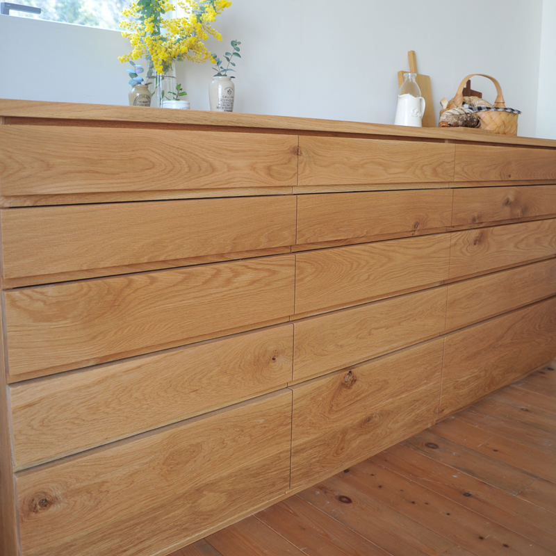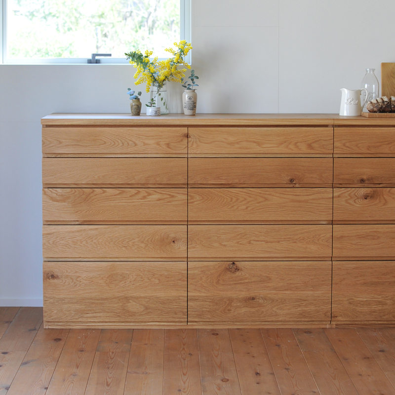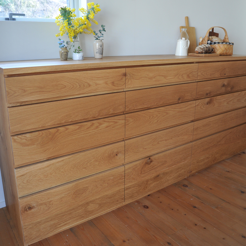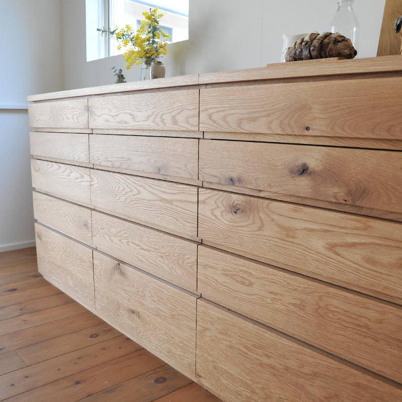 天板や引き出しの表面には無垢材を使用しております。